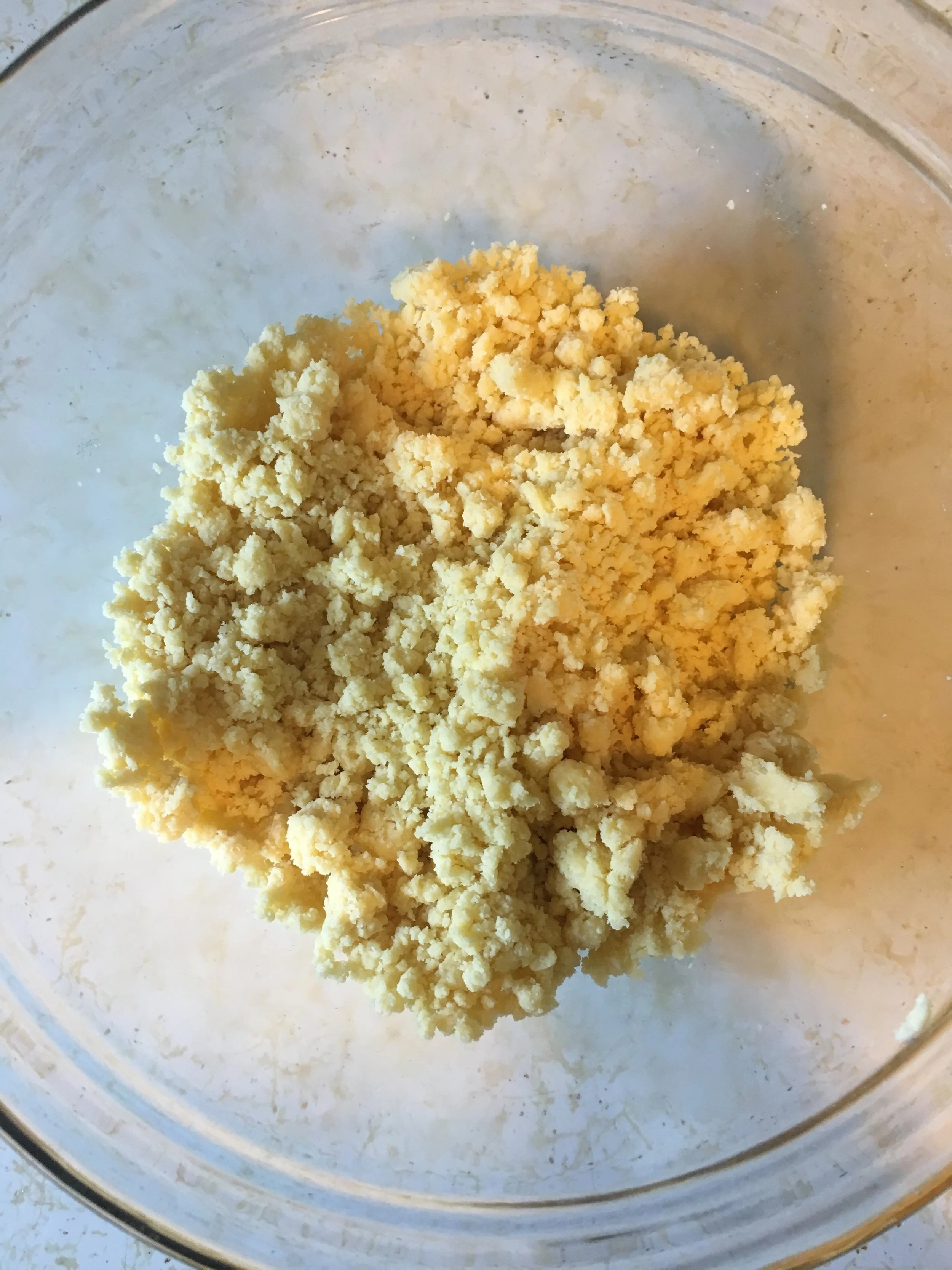 In a small bowl mix the water and apple cider vinegar, it should be really cold. Take the dough out of the freezer, add the apple cider/water mixture 1 tsp at a time. Once the dough holds its shape when pressed together, it is done. Don’t add too much water!